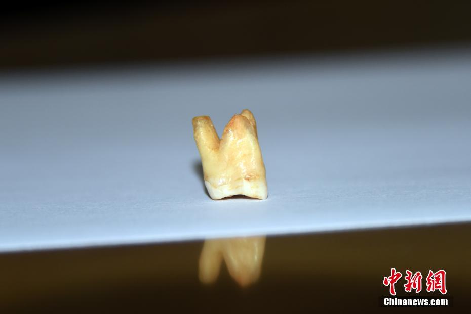 中國(guó)科學(xué)院古脊椎動(dòng)物與古人類研究所(中科院古脊椎所)青年研究員吳妍帶領(lǐng)的研究團(tuán)隊(duì),通過(guò)對(duì)湖南道縣福巖洞遺址出土的、迄今所知東亞最早現(xiàn)代人(8-12萬(wàn)年前)的牙齒化石進(jìn)行牙結(jié)石提取與分析,最新研究發(fā)現(xiàn)東亞最早現(xiàn)代人植物類食物的直接證據(jù),并發(fā)現(xiàn)當(dāng)時(shí)的古人類就已經(jīng)有了剔牙行為。這項(xiàng)重要研究發(fā)現(xiàn)的成果論文,已在國(guó)際專業(yè)學(xué)術(shù)期刊《植物科學(xué)前沿》發(fā)表。圖為9月7日,北京,中科院古脊椎所標(biāo)本館,展示一顆用于本次研究的湖南道縣福巖洞遺址出土、8-12萬(wàn)年前東亞最早現(xiàn)代人牙齒化石標(biāo)本。 中新社記者 孫自法 攝