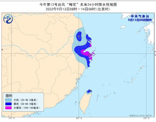 降水預報:9月13日8時至14日8時,臺灣島北部、浙江北部、上海、江蘇東南部等地將有大到暴雨,其中浙江東北部和上海等地的部分地區(qū)有大暴雨(100-140毫米)。