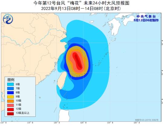 大風預報:9月13日8時至14日8時,巴士海峽、臺灣海峽北部、臺灣以東洋面、黃海西南部海域、東海大部及釣魚島附近海域、長江口區(qū)、杭州灣以及臺灣島北部和東部沿海、浙江沿海、福建北部沿海、上海沿海、江蘇東南部沿海將有6-8級大風,陣風9-11級,其中東海部分海域?qū)⒂?-11級大風,陣風12-14級,“梅花”中心經(jīng)過的附近海面的風力有12-14級,陣風可達15-16級。