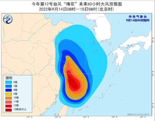 大風(fēng)預(yù)報(bào):9月14日08時(shí)至15日08時(shí),東海大部及釣魚島附近海域、黃海中南部海域、長江口區(qū)、杭州灣以及臺灣島北部沿海、福建北部沿海、山東南部沿海、浙江東部、上海、江蘇東部沿海和地區(qū)將有6-8級大風(fēng),陣風(fēng)9-11級,其中東海中西部海域、浙江中北部沿海、上海沿海、江蘇東南部沿海、杭州灣、長江口區(qū)將有9-11級大風(fēng),陣風(fēng)12-14級,“梅花”中心經(jīng)過的附近海面或地區(qū)的風(fēng)力有12-14級,陣風(fēng)可達(dá)15-16級。