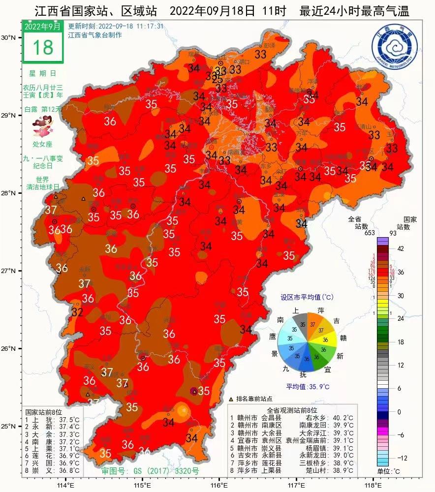 記者從江西省氣象臺和省突發(fā)事件預警信息發(fā)布中心獲悉,9月18日江西省有1159個氣象監(jiān)測站最高氣溫超35℃,90個氣象監(jiān)測站最高氣溫超38℃,覆蓋全省11個地市。