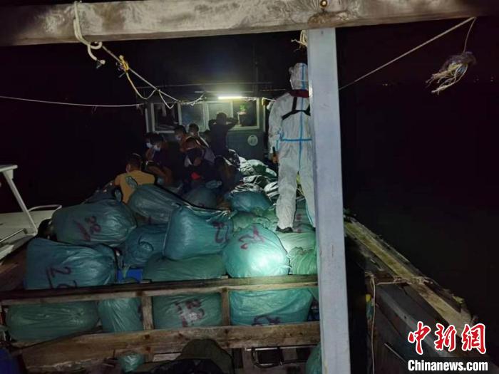 案發(fā)當(dāng)晚22時(shí)許,防城港海警局東興第一工作站執(zhí)法員在海域巡邏時(shí),發(fā)現(xiàn)一艘裝有大量袋裝貨物的漁船,形跡可疑。執(zhí)法員隨即向可疑船鳴笛、喊話亮明身份,要求其立即停船接受檢查,執(zhí)法員穿戴好防護(hù)裝具后,登臨對船上人員進(jìn)行控制。
