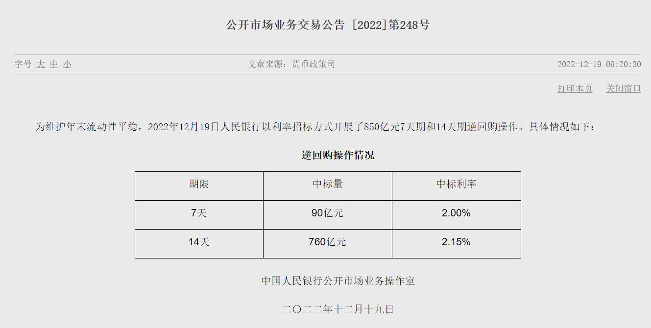 中新網(wǎng)12月19日電 據(jù)央行官網(wǎng)19日消息,為維護(hù)年末流動(dòng)性平穩(wěn),2022年12月19日人民銀行以利率招標(biāo)方式開(kāi)展了850億元7天期和14天期逆回購(gòu)操作。(中新財(cái)經(jīng))