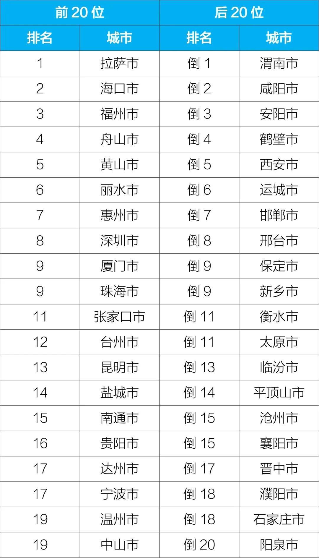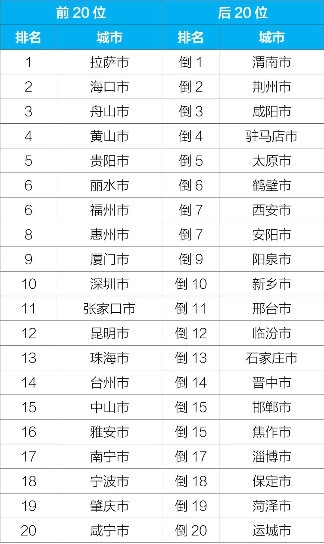 1—11月,168個(gè)重點(diǎn)城市中,拉薩、海口和舟山市等城市空氣質(zhì)量相對(duì)較好(從第1名至第20名);渭南、荊州和咸陽市等城市空氣質(zhì)量相對(duì)較差(從倒數(shù)第1名至倒數(shù)第20名),見附表2。
