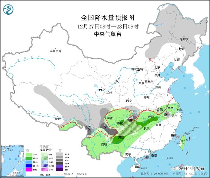 圖1 全國降水量預(yù)報圖(12月26日08時-27日08時)