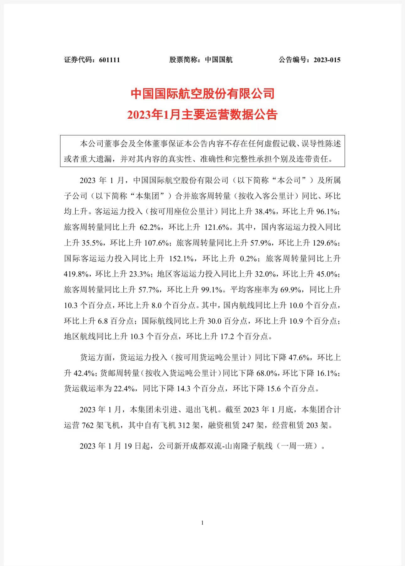公告顯示,2023年1月,中國國航及所屬子公司合并旅客周轉量(按收入客公里計)同比、環(huán)比均上升??瓦\運力投入(按可用座位公里計)同比上升38.4%,環(huán)比上升96.1%;旅客周轉量同比上升62.2%,環(huán)比上升121.6%。