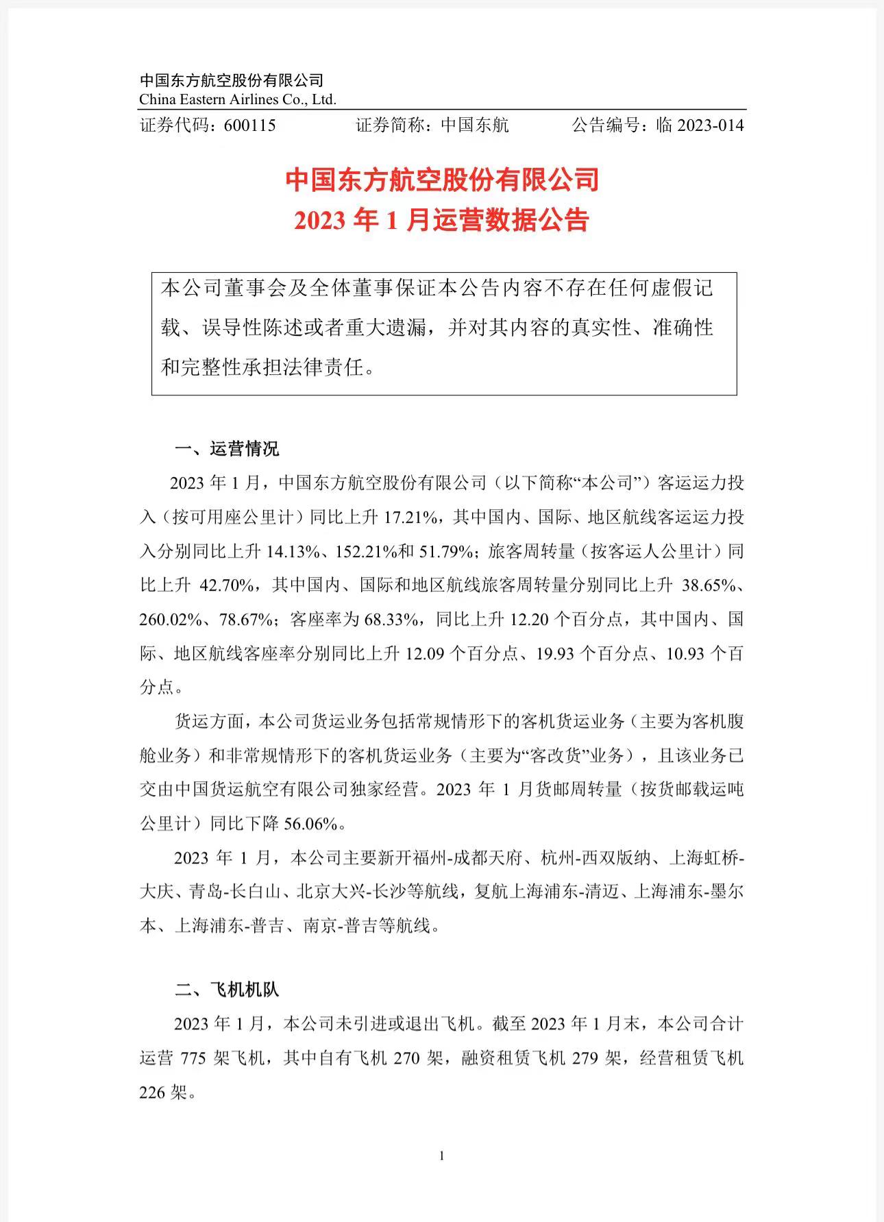 2023年1月,中國東航客運運力投入(按可用座公里計)同比上升17.21%,旅客周轉量(按客運人公里計)同比上升42.70%。