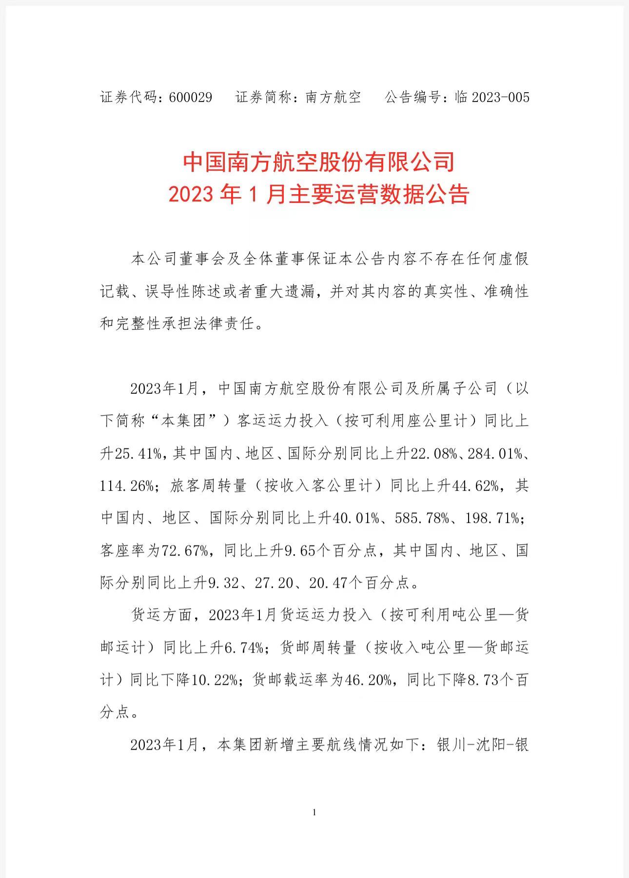 2023年1月,南方航空及所屬子公司客運運力投入(按可利用座公里計)同比上升25.41%,旅客周轉量(按收入客公里計)同比上升44.62%。(中新財經)