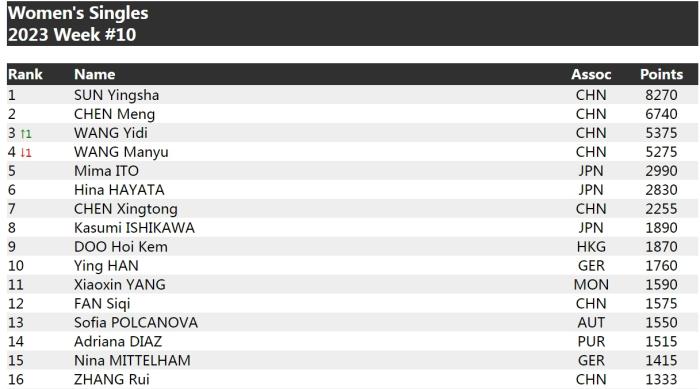 中新網(wǎng)3月7日電 北京時(shí)間3月7日,國(guó)際乒聯(lián)更新2023年第10周世界排名。男單排名中,樊振東、馬龍、王楚欽排名前三。女單方面孫穎莎、陳夢(mèng)、王藝迪位居前三。