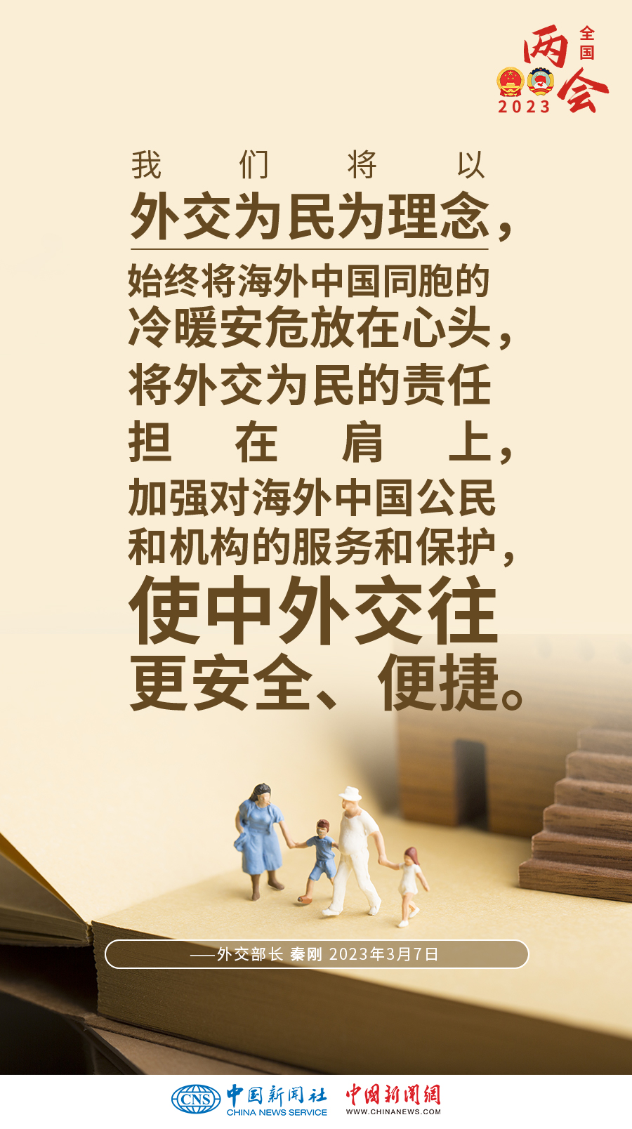 秦剛:我們將以開放發(fā)展為目標(biāo),服務(wù)國(guó)內(nèi)高質(zhì)量發(fā)展和高水平對(duì)外開放,反對(duì)“脫鉤斷鏈”,反對(duì)單邊制裁,維護(hù)開放包容的世界經(jīng)濟(jì),以中國(guó)新發(fā)展為世界提供新機(jī)遇。我們將以多邊主義為路徑,推動(dòng)構(gòu)建人類命運(yùn)共同體,推進(jìn)國(guó)際關(guān)系民主化,推動(dòng)全球治理朝著更加公正合理的方向發(fā)展,為解決人類面臨的共同挑戰(zhàn)貢獻(xiàn)更多、更好的中國(guó)智慧、中國(guó)方案。我們將以外交為民為理念,始終將海外中國(guó)同胞的冷暖安危放在心頭,將外交為民的責(zé)任擔(dān)在肩上,加強(qiáng)對(duì)海外中國(guó)公民和機(jī)構(gòu)的服務(wù)和保護(hù),使中外交往更安全、便捷。