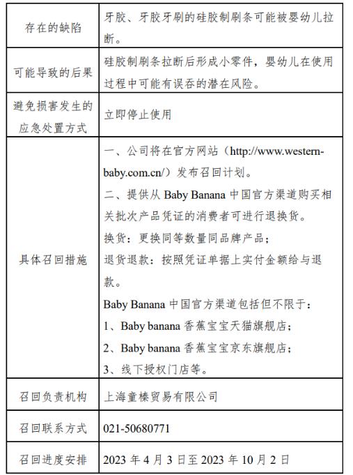 98萬(wàn)件香蕉寶寶牌硅膠嬰兒牙膠、牙膠牙刷召回