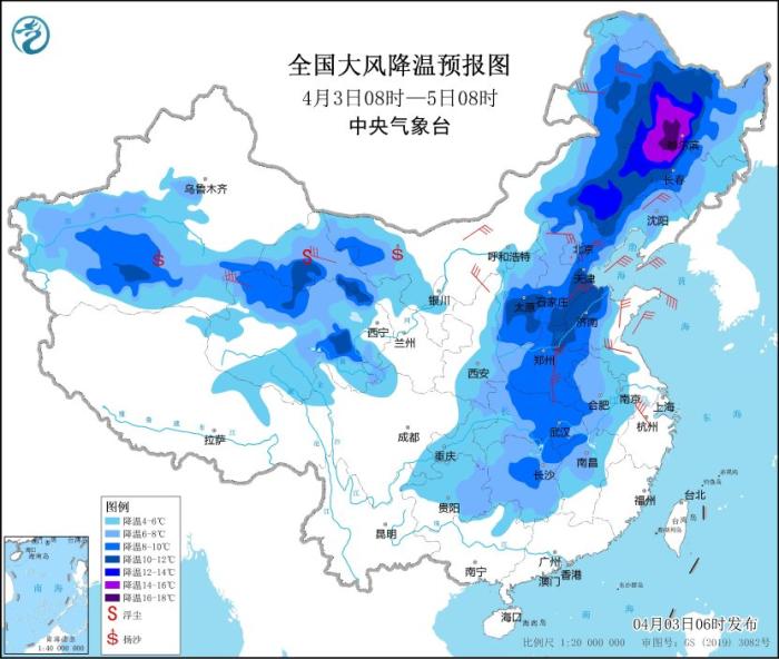 圖1 全國大風(fēng)降溫預(yù)報圖(4月3日08時至5日08時)