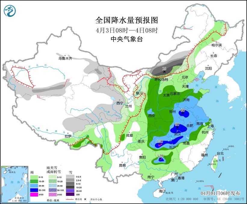 明天開始,大范圍雨雪將鋪展開來,內(nèi)蒙古河套地區(qū)、西藏東部、西北地區(qū)東部、華北南部和西部、黃淮西部、江漢、江南北部、西南地區(qū)東北部等地部分地區(qū)有中到大雨,其中,河南南部、湖北北部和南部、湖南北部等地部分地區(qū)有暴雨或大暴雨。預(yù)計本輪雨雪天氣過程主要出現(xiàn)時段在4月2日至4日。