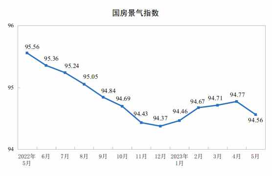 5月份,房地產(chǎn)開發(fā)景氣指數(shù)(簡(jiǎn)稱“國房景氣指數(shù)”)為94.56。