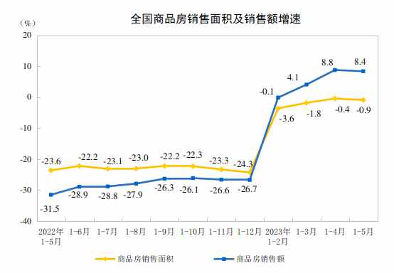 1—5月份,商品房銷售面積46440萬平方米,同比下降0.9%,其中住宅銷售面積增長(zhǎng)2.3%。商品房銷售額49787億元,增長(zhǎng)8.4%,其中住宅銷售額增長(zhǎng)11.9%。