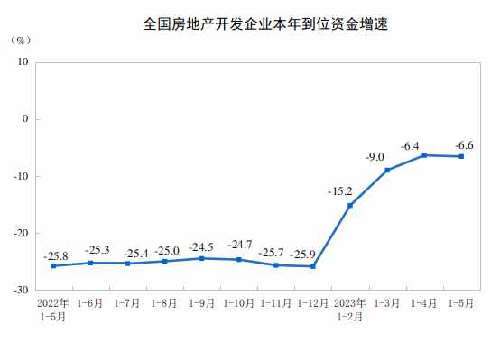 1—5月份,房地產(chǎn)開發(fā)企業(yè)到位資金55958億元,同比下降6.6%。其中,國內(nèi)貸款7175億元,下降10.5%;利用外資13億元,下降73.5%;自籌資金16267億元,下降21.6%;定金及預(yù)收款19878億元,增長(zhǎng)4.4%;個(gè)人按揭貸款10354億元,增長(zhǎng)6.5%。