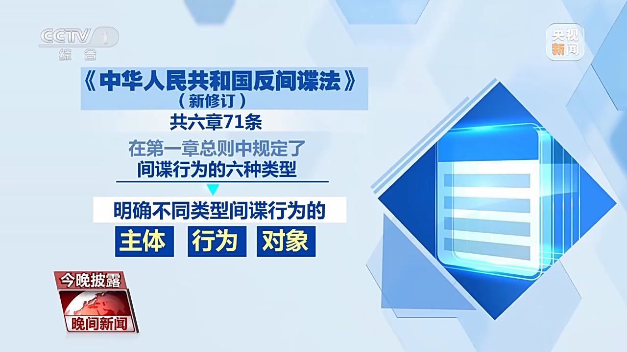 國家安全是安邦定國的重要基石。近年來,我國面臨的安全威脅日趨多元,反間諜斗爭形勢(shì)也更加嚴(yán)峻復(fù)雜。從本月起,新修訂的《反間諜法》開始施行。新法對(duì)間諜行為,做出進(jìn)一步充實(shí)和細(xì)化。那么按照新法,哪些行為將被認(rèn)定為間諜行為?作為普通群眾,一旦發(fā)現(xiàn)間諜行為,又該如何處理呢?今晚披露,一塊來關(guān)注。