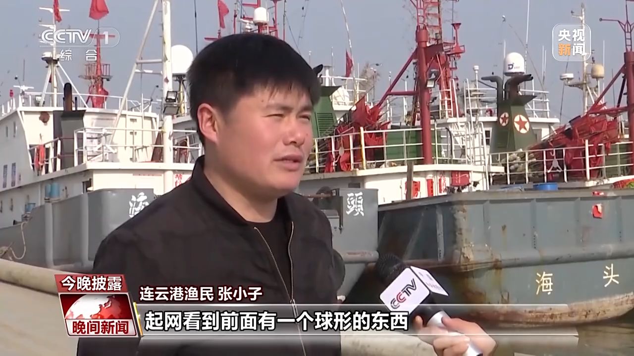 連云港漁民 張小子:起網(wǎng)看到前面有一個(gè)球形的東西,也不知道什么,就撈上來一看,上面還有外國字。講座說撿到有外國可疑的裝置,可以上交,我們船上有衛(wèi)星電話,打電話聯(lián)系,國家還給了獎(jiǎng)勵(lì)。