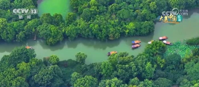 這里是杭州西溪國家濕地公園。盛夏時節(jié),杭州西溪濕地草木蔥蘢、綠樹成蔭,鷺舞燕翔、荷香魚躍,星羅棋布的魚塘呈現(xiàn)出“萬塘攬勝”的美景。這里生態(tài)資源豐富,有維管束植物739種、鳥類203種、昆蟲911種、魚類56種。二十年來,杭州西溪濕地以保護原生態(tài)為目標,統(tǒng)籌生產(chǎn)、生活、生態(tài)三大空間布局,探索了一條濕地保護與利用雙贏的道路。