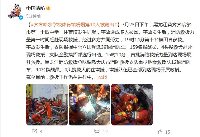 中新網(wǎng)7月23日電 據(jù)中國消防官微消息,7月23日下午,黑龍江省齊齊哈爾市第三十四中學(xué)一體育館發(fā)生坍塌,事故造成多人被困。事故發(fā)生后,消防救援力量第一時(shí)間趕赴現(xiàn)場(chǎng)救援,經(jīng)過多方共同努力,19時(shí)14分第十名被困者獲救。