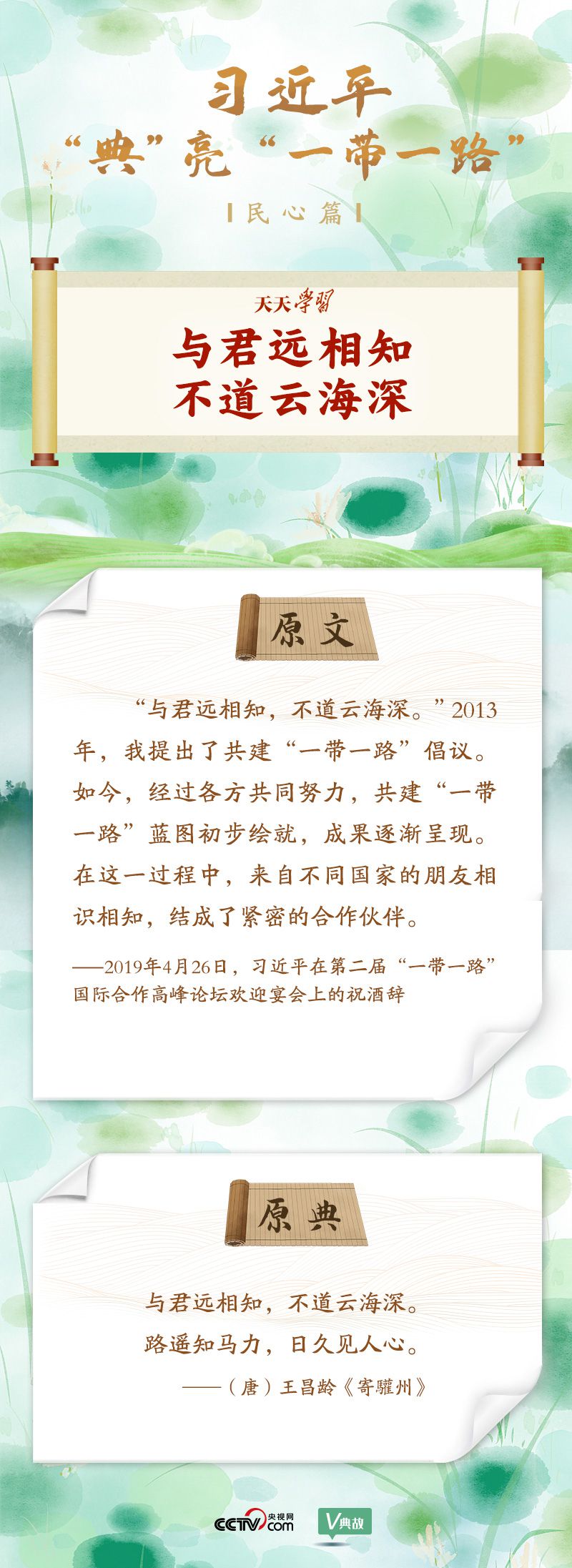 在國內(nèi)國際多個重要場合,習近平主席頻頻引經(jīng)據(jù)典,介紹“一帶一路”承載的厚重歷史,闡述“一帶一路”建設(shè)的理念和重大意義,描繪“一帶一路”美好的發(fā)展愿景。央視網(wǎng)《天天學習》欄目特選取習近平主席的部分用典,與您一起學習領(lǐng)會。