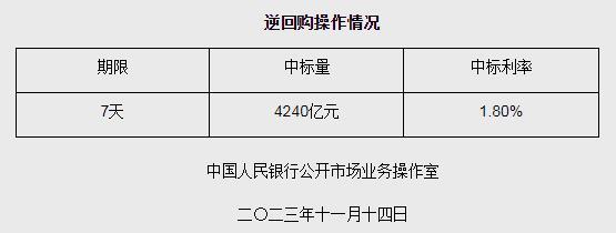 中新網11月14日電 據央行網站消息,為維護銀行體系流動性合理充裕,2023年11月14日人民銀行以利率招標方式開展了4240億元逆回購操作,中標利率1.80%,期限為7天。具體情況如下: