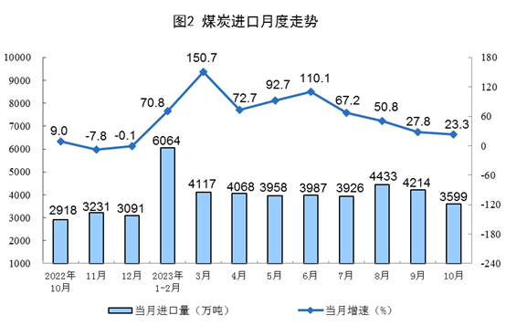 原煤生產(chǎn)增速加快,進(jìn)口較快增長(zhǎng)。10月份,生產(chǎn)原煤3.9億噸,同比增長(zhǎng)3.8%,增速比9月份加快3.4個(gè)百分點(diǎn),日均產(chǎn)量1254.0萬(wàn)噸。進(jìn)口煤炭3599萬(wàn)噸,同比增長(zhǎng)23.3%,增速比9月份回落4.5個(gè)百分點(diǎn)。