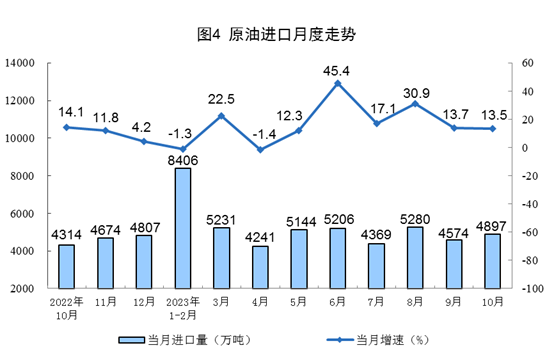 原油生產(chǎn)增速略有加快,進(jìn)口保持較快增長(zhǎng)。10月份,生產(chǎn)原油1733萬(wàn)噸,同比增長(zhǎng)0.5%,增速比9月份加快0.2個(gè)百分點(diǎn),日均產(chǎn)量55.9萬(wàn)噸。進(jìn)口原油4897萬(wàn)噸,同比增長(zhǎng)13.5%,增速比9月份放緩0.2個(gè)百分點(diǎn)。