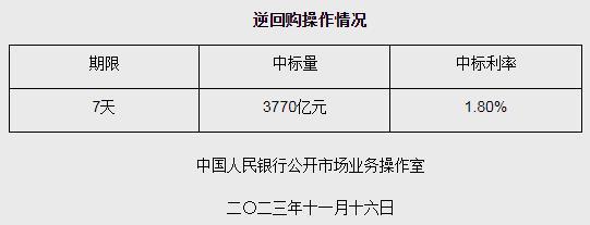 中新網(wǎng)11月16日電 據(jù)央行網(wǎng)站消息,為維護銀行體系流動性合理充裕,2023年11月16日人民銀行以利率招標方式開展了3770億元逆回購操作,中標利率1.80%,期限為7天。具體情況如下: