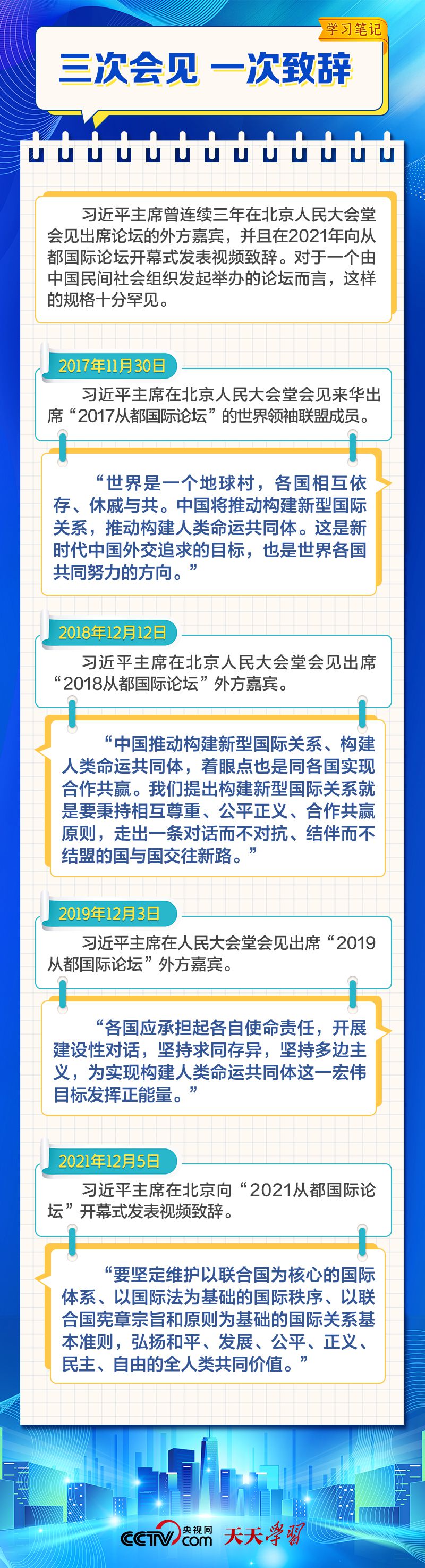 天天學(xué)習(xí) 12月4日,習(xí)近平主席在致“2023從都國際論壇”的賀信中強(qiáng)調(diào),面對(duì)前所未有的世界之變、時(shí)代之變和歷史之變,人類社會(huì)必須團(tuán)結(jié)起來,堅(jiān)持互學(xué)互鑒、開放包容、合作共贏,弘揚(yáng)全人類共同價(jià)值,共同建設(shè)更加美好的世界。