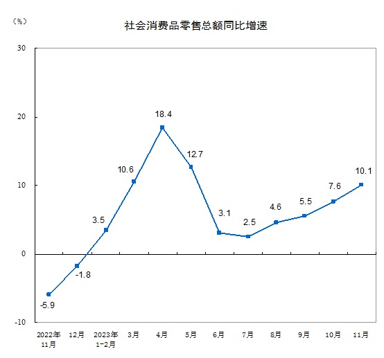 國家統(tǒng)計局:11月份社會消費品零售總額增長10.1%