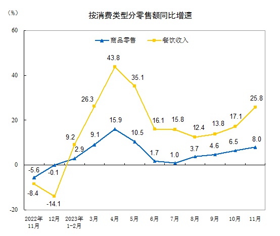 按消費類型分,11月份,商品零售36925億元,同比增長8.0%;餐飲收入5580億元,增長25.8%。1—11月份,商品零售380460億元,同比增長5.9%;餐飲收入47485億元,增長19.4%。