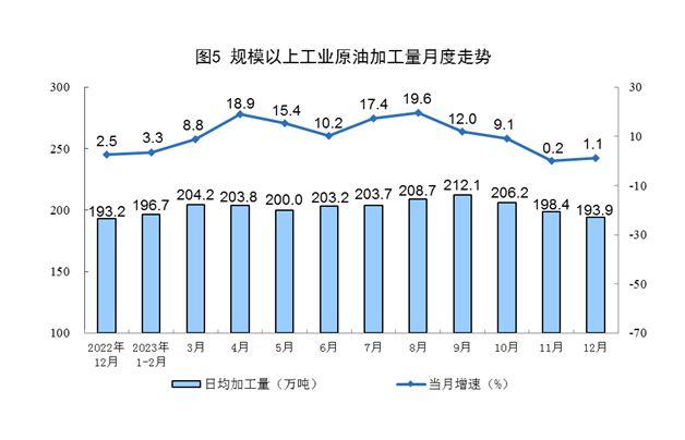 原油加工增速略有加快。12月份,規(guī)上工業(yè)原油加工量6011萬(wàn)噸,同比增長(zhǎng)1.1%,增速比11月份加快0.9個(gè)百分點(diǎn),日均加工193.9萬(wàn)噸。2023年,規(guī)上工業(yè)原油加工量73478萬(wàn)噸,同比增長(zhǎng)9.3%。