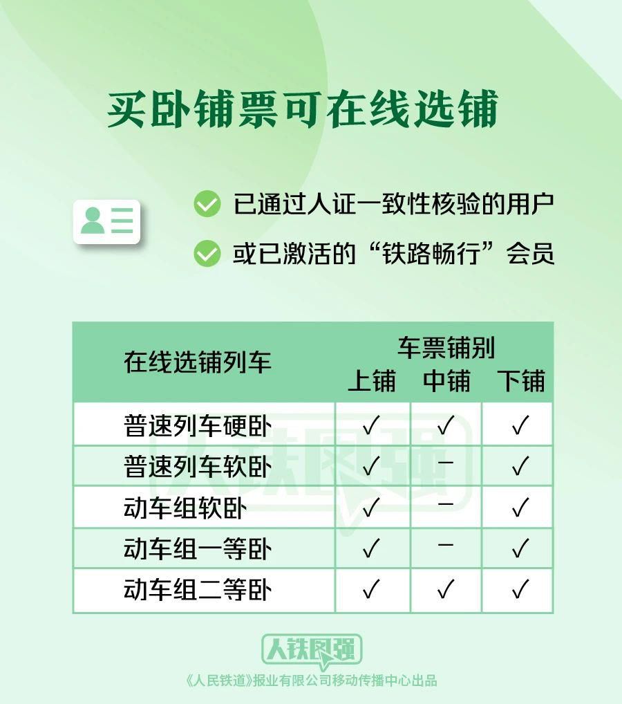 旅客在鐵路12306網(wǎng)站和App上購(gòu)買臥鋪車票時(shí),普速列車軟臥、硬臥和動(dòng)車組軟臥、一等臥、二等臥等鋪別可在線自主選鋪。
