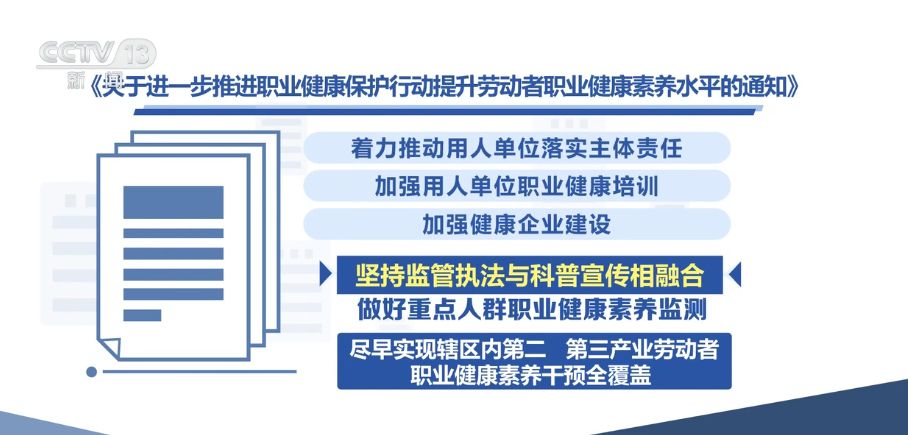 央視網(wǎng)消息:國(guó)家衛(wèi)生健康委、國(guó)家疾控局、教育部等八部門近日聯(lián)合印發(fā)《關(guān)于進(jìn)一步推進(jìn)職業(yè)健康保護(hù)行動(dòng)提升勞動(dòng)者職業(yè)健康素養(yǎng)水平的通知》。《通知》明確,進(jìn)一步加強(qiáng)職業(yè)健康管理,加大重點(diǎn)人群職業(yè)健康素養(yǎng)干預(yù)力度,到2030年,力爭(zhēng)實(shí)現(xiàn)重點(diǎn)行業(yè)勞動(dòng)者對(duì)本崗位主要危害及防護(hù)知識(shí)知曉率不低于90%。