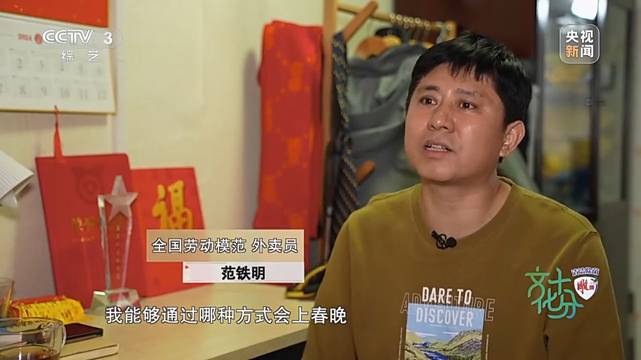 全國(guó)勞動(dòng)模范 外賣員 范鐵明:2023年,我被評(píng)為全國(guó)最美外賣配送員,這個(gè)獎(jiǎng)項(xiàng),不單純是給我個(gè)人的,實(shí)際上是對(duì)新就業(yè)群體,對(duì)騎手的一個(gè)認(rèn)可。根本就沒有想到我能夠通過哪種方式會(huì)上春晚,因?yàn)槲矣植皇菍I(yè)的演職人員,當(dāng)時(shí)我并不是很相信,我們分配的是《勞動(dòng)最光榮》,它是一個(gè)通過動(dòng)畫片的形式,就是我們兒時(shí)都會(huì)看一些動(dòng)畫片,動(dòng)畫片里都會(huì)有一些主人公,比如說《黑貓警長(zhǎng)》當(dāng)中的黑貓警長(zhǎng),《大鬧天宮》里的孫悟空,包括《小貓釣魚》里頭的貓媽媽,當(dāng)然都是我們當(dāng)時(shí)崇拜的一個(gè)對(duì)象,最終我們成為或即將成為他們。