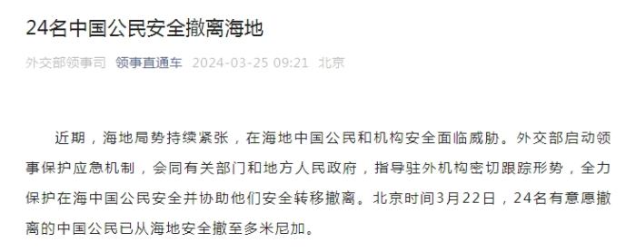中新網(wǎng)3月25日電 據(jù)外交部領(lǐng)事司微信公眾號“領(lǐng)事直通車”25日消息,近期,海地局勢持續(xù)緊張,在海地中國公民和機構(gòu)安全面臨威脅。外交部啟動領(lǐng)事保護應急機制,會同有關(guān)部門和地方人民政府,指導駐外機構(gòu)密切跟蹤形勢,全力保護在海中國公民安全并協(xié)助他們安全轉(zhuǎn)移撤離。北京時間3月22日,24名有意愿撤離的中國公民已從海地安全撤至多米尼加。