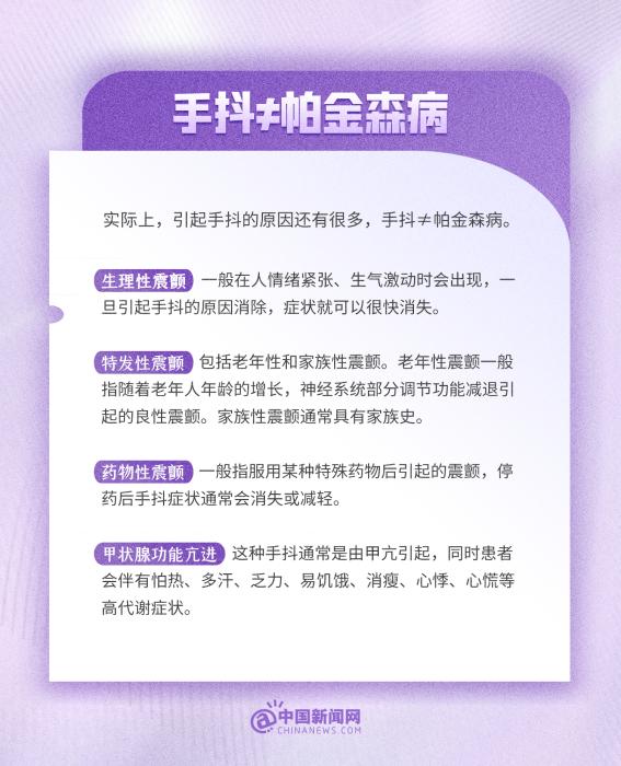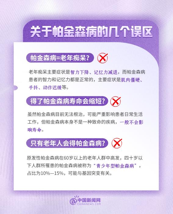 中新網(wǎng)4月11日電 帕金森病是威脅老年人健康的“沉默殺手”。帕金森病=老年癡呆?得了帕金森病壽命會縮短?只有老年人會得帕金森?。拷裉焓鞘澜缗两鹕∪?,這些有關(guān)帕金森病的小知識,一起了解!