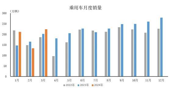 2024年3月,乘用車產(chǎn)銷分別完成225萬輛和223.6萬輛,環(huán)比分別增長76.7%和67.8%,同比分別增長4.7%和10.9%。