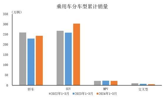 2024年1-3月,在乘用車主要品種中,與上年同期相比,運(yùn)動(dòng)型多用途乘用車(SUV)產(chǎn)銷呈兩位數(shù)增長,基本型乘用車(轎車)產(chǎn)銷小幅增長,多功能乘用車(MPV)和交叉型乘用車產(chǎn)銷呈不同程度下降。