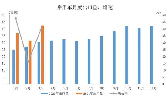 2024年3月,乘用車出口42.4萬輛,環(huán)比增長34.6%,同比增長39.3%。