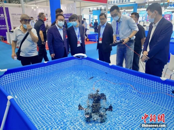 資料圖:2022年11月16日,在深圳舉行的第二十四屆中國國際高新技術成果交易會上,參展商攜“黑科技”產品亮相高交會。圖為深圳企業(yè)研制的潛鮫P200 PRO行業(yè)級水下機器人。 中新社記者 陳文 攝