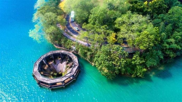 日月潭水位若高于748.5米,過(guò)多的水會(huì)從溢流井排到下游溪流;因此溢流井有“日月潭神秘黑洞”之稱。圖片來(lái)源:日月潭風(fēng)管處