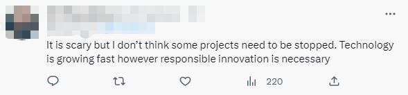 還有人分析,“這很可怕,但我認(rèn)為有些項(xiàng)目不需要停止。技術(shù)正在發(fā)展迅速,負(fù)責(zé)任的創(chuàng)新也是必要的。”