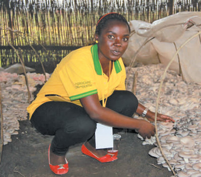 盧旺達(dá)國立大學(xué)的學(xué)生姍臺在菇棚中采收平菇。