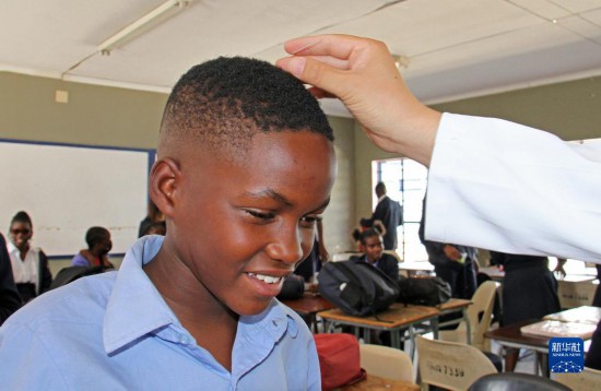 4月3日,在納米比亞溫得和克的伊曼紐爾·謝菲迪中學課堂上,一名學生體驗拔火罐。新華社發(fā)(穆薩·卡薩克攝)