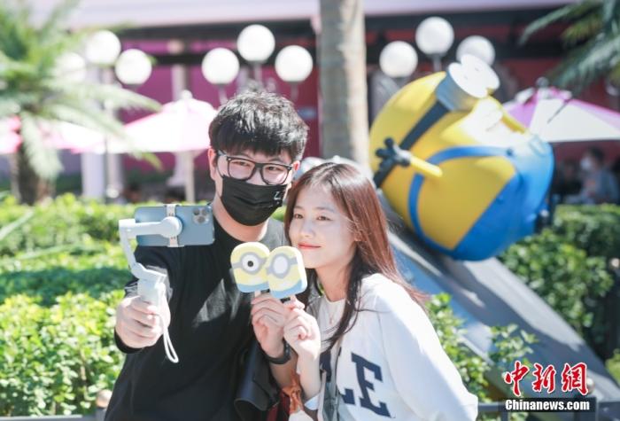 北京環(huán)球影城內,游客正在自拍。 中新社記者 賈天勇 攝
