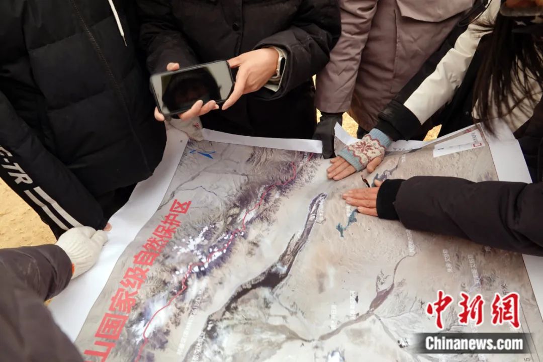 2023年4月,第三次新疆科考阿爾金山野外科考隊(duì)一行,前往阿爾金山國家級自然保護(hù)區(qū)庫木庫里沙漠的沙子泉考察調(diào)研,遭遇強(qiáng)沙塵暴天氣,科考隊(duì)員查看地圖。孫自法 攝