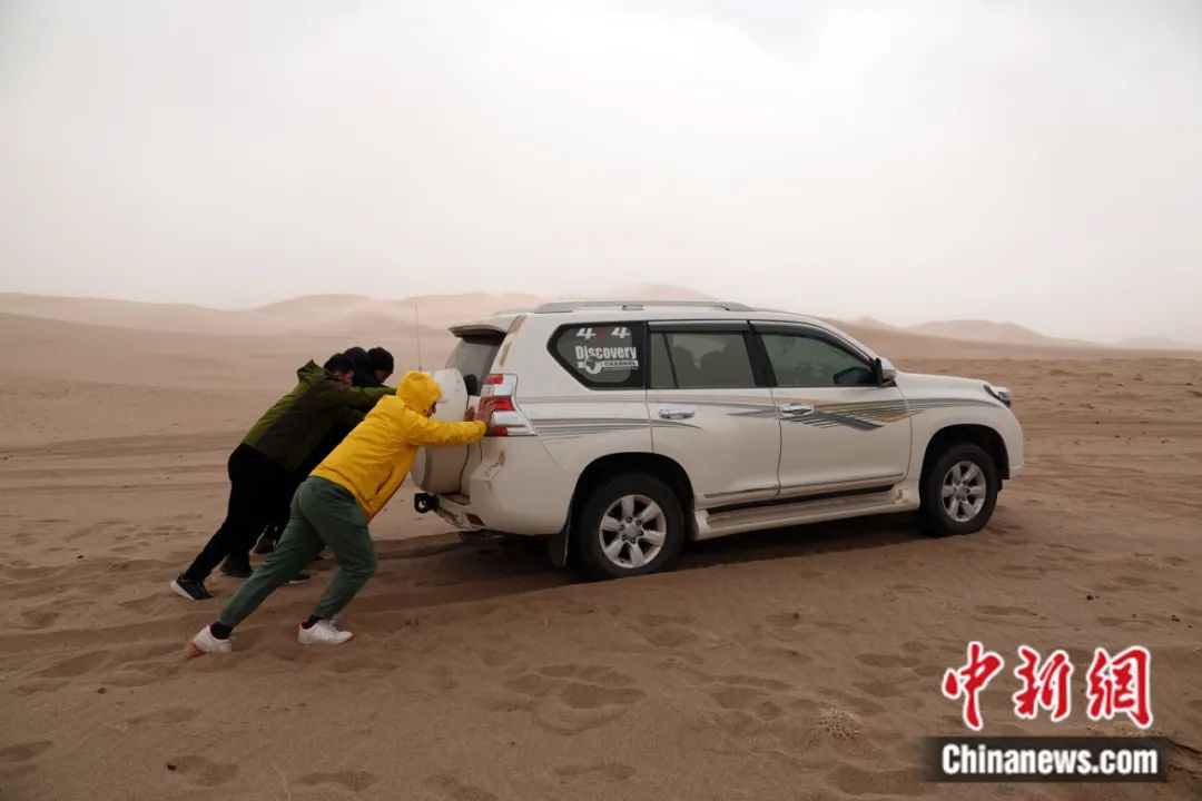 2023年4月,第三次新疆科考阿爾金山野外科考隊(duì)一行,前往阿爾金山國家級自然保護(hù)區(qū)庫木庫里沙漠的沙子泉考察調(diào)研,遭遇強(qiáng)沙塵暴天氣,科考隊(duì)員推車。孫自法 攝