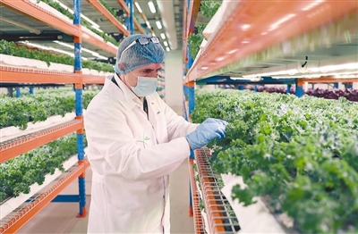 在阿聯(lián)酋迪拜阿勒馬克圖姆國際機場不遠處,一棟四四方方、外觀簡約的辦公樓里,垂直農(nóng)場“我的菜園”里一派繁忙景象。